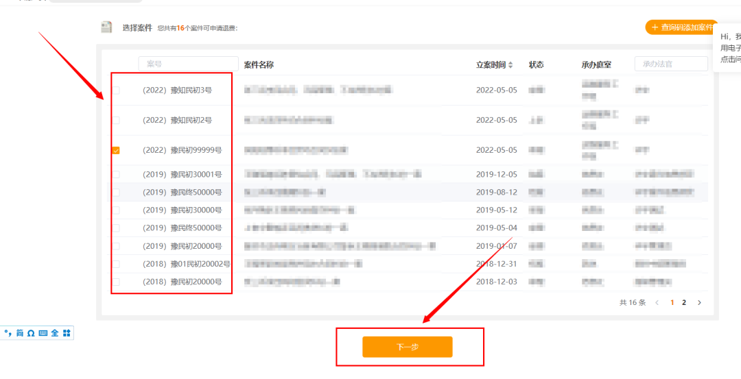 3. 在申请退费窗口中,选择退费案件,点击下一步,如下图所示: